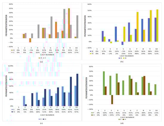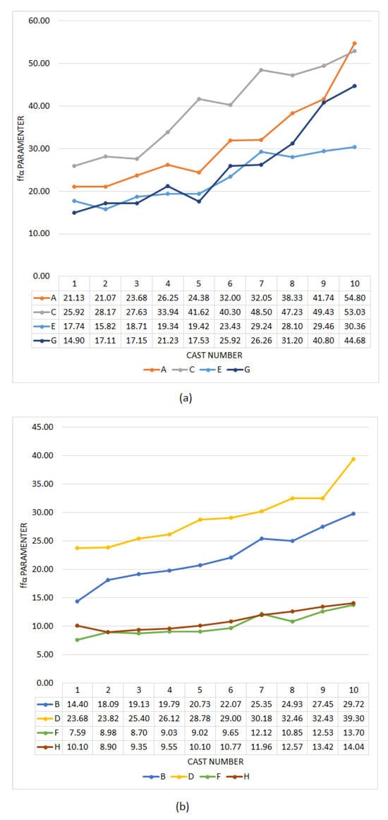 The analysis indicates a direct correlation between the number of casts and the resulting ff value, suggesting that more casts lead to higher values. This is attributable to the deterioration of the silicone mold. The values obtained for the two last measurements corresponding to casts number nine and ten, show a high increase in the deviation from the first and second measurements. This deterioration of the molds is higher when silicon 4601 is used (Cases C,D,G,H). This effect could be seen on Figure 14 Analysis of the deterioration of molds as a function of the silicone used. Furthermore, in the figure it could be seen that the use of the resin R2196 aggravates the problem of mold deterioration in both silicones.