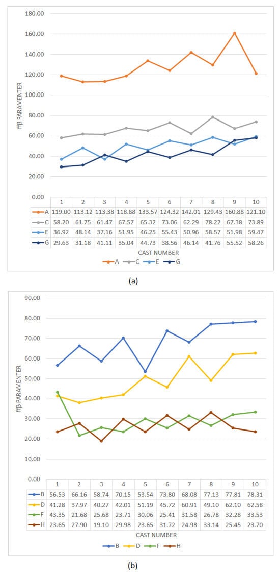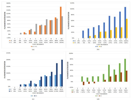 When analyzing the casting cycle, a detrimental influence on the ff value is observed, as evidenced by the ff study except for PR700 and high quality model where the relationship is not clear. In Figure 20, which presents the analysis of mold deterioration as a function of ff measurements, the evolution of the difference between measurements (%) of the ff parameter can be seen. It is noteworthy that the value of this parameter deteriorates proportionally with the increase in the number of castings.