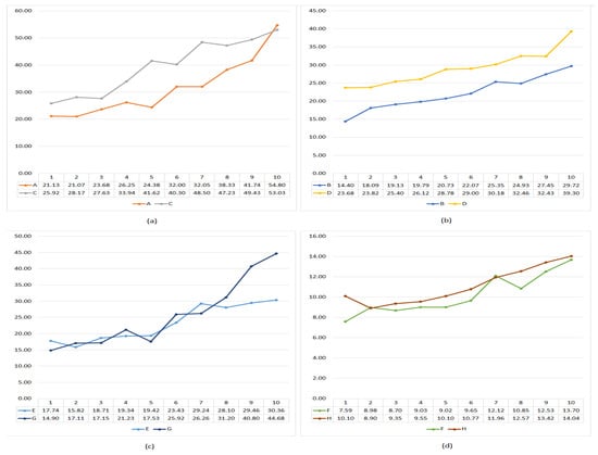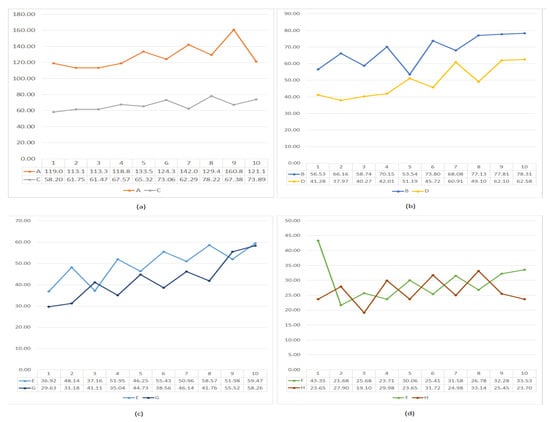 The most relevant factor is the type of resin. Specifically, analysing the results for the same quality level gear model, the type of resin that yields the lowest ff (the desired outcome) is PR700 (series E, F, G, H), while the gears manufactured with the RECAPOLI 2196 resin exhibit the highest ff parameter value, as can be seen in Figure 13a,b.