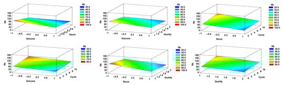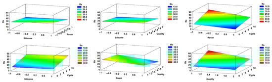 Figure 16 shows the response surfaces obtained for ff as a combination of each of the factors. These surfaces make it possible to determine the corresponding factor ff to be reached for a specific casting number value as a function of the silicone, the quality of the original model and the resin used for the manufacture of the castings.