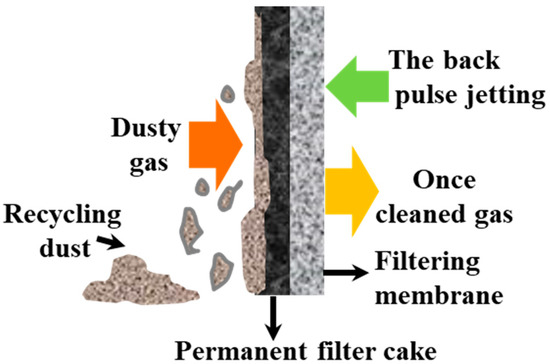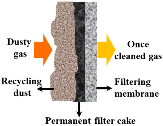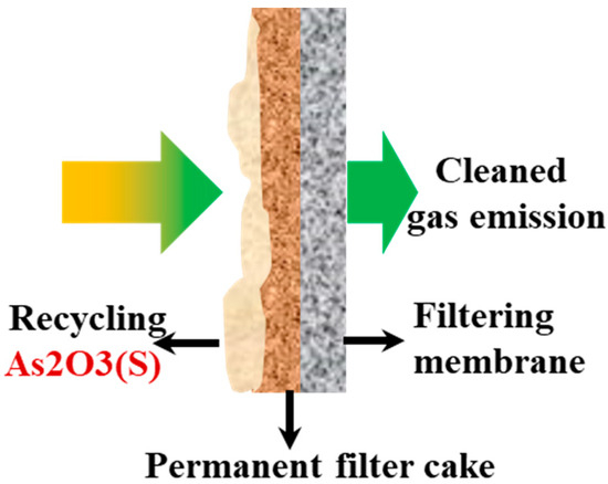 The first-filtration system separated arsenic and other particulate matter from flue gas at high temperatures. This system was responsible for the purification of high-temperature flue gas from metal smelting. When the smelting flue gas flowed through the Fe-25Al porous body, double interception occurred. Particles larger than 10 μm in the flue gas were mechanically intercepted by the pore channels, while a filter cake intercepted submicron particles between 0.1 and 10 μm (Figure 2). The core technology of the initial filtration step is the porous material. The Fe-25Al porous material is one of the best optimum alloy materials [47], with excellent high-temperature resistance and strong chemical stability [48]. It can effectively capture and collect mineral dust in flue gas from metal smelting. Meanwhile, arsenic is oxidized into arsenic oxide during filtration at high temperature. Optimizing the first filtration system can improve the separation efficiency of flue gas and reduce secondary pollution.