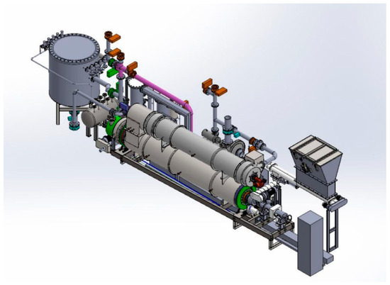 The pilot test was conducted in a rotary furnace, and the schematic diagram of the complete equipment is shown in Figure 5 and Equipment Structure Diagram is shown in Figure 6. Copper concentrate is loaded into a rotary furnace driven by an electric motor. The rotary furnace has a certain inclination angle, and, during the rotation process, minerals gradually flow from the inlet to the outlet. After heating and decomposition, arsenic containing dust and arsenic-free copper concentrate are generated. The equipment, as a whole, is in a negative pressure state drawn by the filter, and the flue gas flows to the filter for high-temperature gas–solid separation. Under high temperature conditions, gaseous arsenic oxide enters the pipeline for cooling and condenses before entering the bag arsenic collection system. The heat generated during the decomposition process is provided by the combustion diesel flue gas in the combustion chamber, which heats the outer wall of the rotary furnace to increase the temperature. The roasting equipment is provided by Tianyuan (Tianyuan Machinery Equipment Technology Co., Ltd., Guangzhou, China) and the FeAl porous membrane in the filter is provided by Yitai (Yitai Technology Co., Ltd., Chengdu, China).