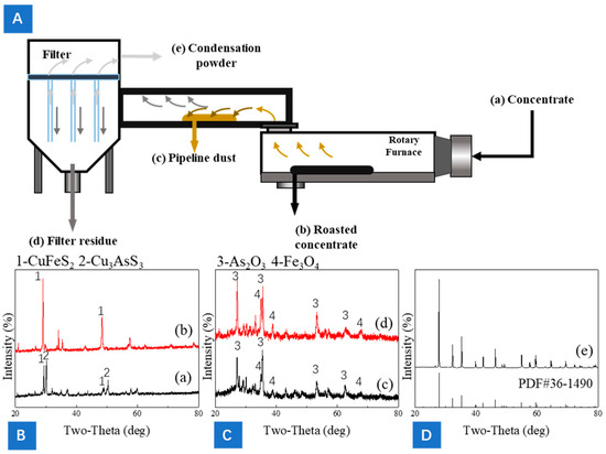 Analysis on the filtrated products by Fe-25Al porous material. Output route of the products (A); XRD pattern of the raw mineral and products (B), concentrate (a) and roasted concentrate (b); XRD pattern of pipeline dust and filter residue (C), pipeline dust (c) and filter residue (d); XRD pattern of the condensation powder and standard card of As2O3 (D), condensation powder (e).