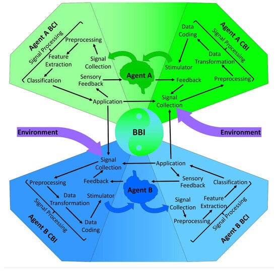 For systems involving computer-mediated conversion of sensor/program signals into neural stimuli, the separate term CBI (computer–brain interface) is useful, denoting centripetal signal flow toward the CNS. The most critical application of this type is restoring lost sensory functions. Finally, we must consider BCBI—systems combining both aforementioned interface types to create bidirectional interaction between neural structures of one or multiple users via computational processing, analogous to “brain-machine-brain interfaces” (BMBI) [11]. Thus, NCIs may be unidirectional (BCI or CBI) or bidirectional (BCBI/BMBI). For brain-to-brain communication involving information extraction, processing, and transfer, the more compact term “brain–brain interfaces” (BBI) is sometimes used [12,13].