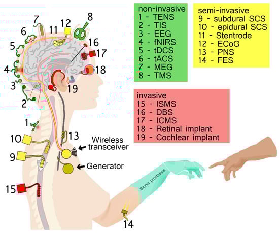 Neural tissue stimulation employs diverse techniques depending on the target applications. Electromagnetic methods include transcutaneous electrical nerve stimulation (TENS) [42], peripheral nerve stimulation (PNS) [39], spinal cord stimulation (SCS), including transcutaneous spinal cord stimulation (tSCS) [43,44]; transcranial direct and alternating current stimulation (tDCS and tACS, respectively) [45], transcranial random noise stimulation (tRNS) [46], noisy galvanic vestibular stimulation (nGVS) [47], trans-spinal magnetic stimulation (ts-MS) [2] and transcranial magnetic stimulation (TMS) for non-invasive impact [48]. Deep brain stimulation (DBS) and intracortical microstimulation (ICMS/ISMS) [49,50] are invasive methods. The non-invasive temporal interference stimulation (TIS) method has shown promising potential, and along with focused ultrasound stimulation (FUS) is gaining popularity as a research tool [51,52,53]. While successful in optogenetic partial vision restoration [54], this technology remains in active research stages.