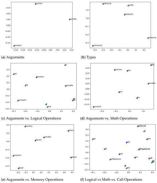 Basic embeddings of Yul elements were analyzed to demonstrate that the relationships between entities are effectively captured and that the proposed method is capable of identifying the semantic characteristics of Yul instructions and their arguments. To facilitate the interpretation of results, entities were categorized into several functional groups: function arguments, data types, logical operations, arithmetic operations, memory/storage operations (for reading and writing data to memory or blockchain storage), and call operations (used to invoke functions from external contracts).