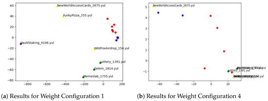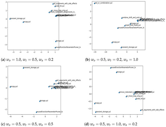 Figure 6. The figure shows four visualizations of the vectorized Yul scripts using different weighting schemes for operations, types, and arguments. The specific weight configurations are as follows:
