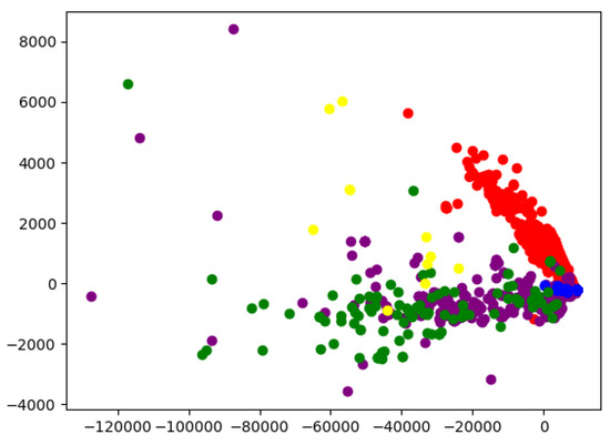 Figure 7. Clear clusters are observed for both initial code and library contracts, which are located near each other yet distinctly separated from other categories. ERC-20 contracts, though more widely dispersed along the X-axis, tend to concentrate along the lower region of the Y-axis. In contrast, ERC-721 contracts are mostly positioned above ERC-20 samples. The “Other” category does not form a well-defined cluster, which may be attributed to the limitations of automatic categorization. However, it is also reasonable to assume that contracts outside the predefined categories could still share similar characteristics with them.