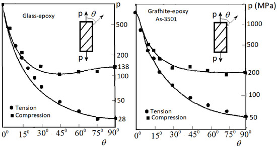 The literature provides experimental data on the permissible stress values for rectangular specimens made of composite materials that are under uniaxial tension–compression conditions by the loads of p. Limit stress values for glass-epoxy and graphite-epoxy specimens, in which reinforcing elements are placed at an angle θ to the direction of the applied load, are shown in Figure 1. Experimental data for tension is shown here in circles, and for compression in squares [22].