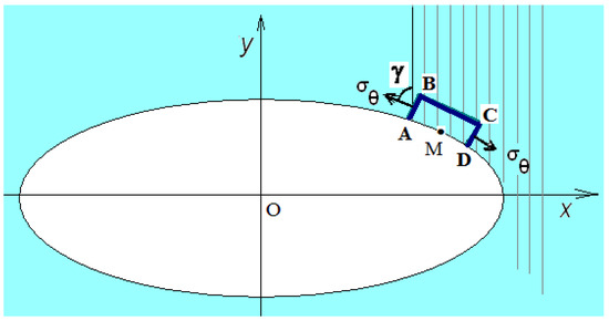 We will consider the case of a load-free hole. Consider an arbitrary point M on the boundary of the hole (Figure 2) and denote the hoop stresses in it by σθ. Consider a quadrilateral element of small dimensions ABCD, which is adjacent to the boundary and contains the point M.