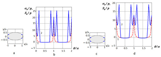 In Figure 3 curves 1 (dashed lines) represent the hoop stresses divided into p at the boundary of an elliptical hole with a ratio of semi-axes of 0.5 for graphite-epoxy (Figure 3b), as well as for boron-epoxy (Figure 3d) plates when the reinforcing elements are parallel to the Oy-axis. Solid curves 2 represent the value of , which is the starting point for strength calculation. Figure 3a,c are the shape of the hole in the plate. The dots indicate the points on the boundary where fracturing will begin (the values are much greater than the maximum stresses). In Figure 3, on the left, there are the points of the ellipse at which the value is maximum, and therefore it predicts the beginning of the initiation of fracture.