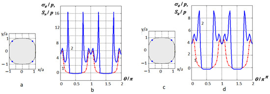 Let us consider a square-shaped hole with its half sides and vertices rounded by arcs of a circle with radius a/2 (Figure 4a,c). Calculated relative stress and the value /p are shown in Figure 4.