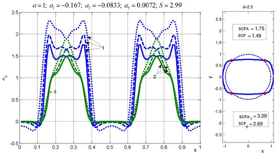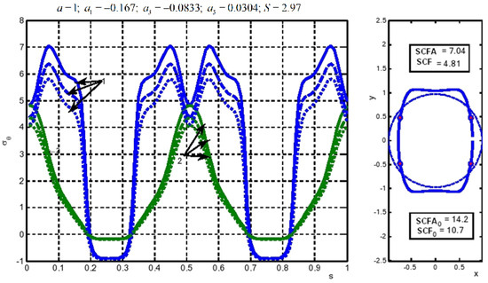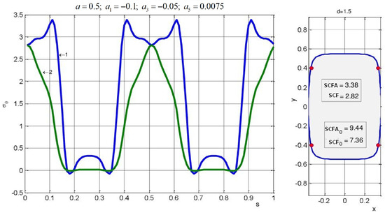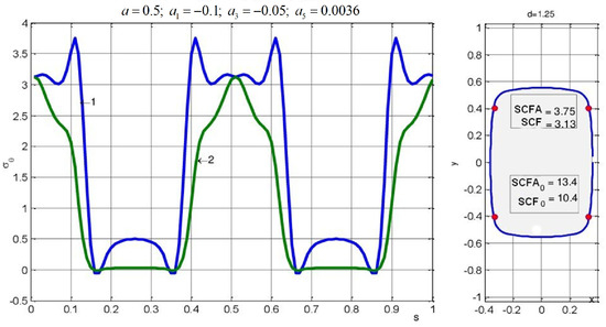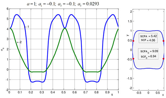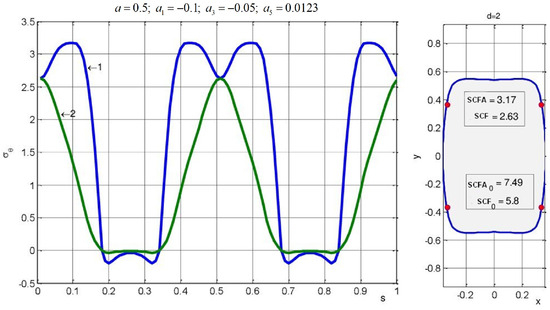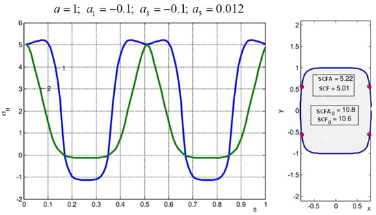 The calculated shapes of the holes and the distribution of relative stresses on them for a graphite-epoxy plate are shown in Figure 6 and for a boron-epoxy plate in Figure 6. Values of calculated here are given by lines 1, while the hoop stresses divided into p are given by lines 2. The values of the coefficients in Formula (6) are given above. The shape of the hole is shown on the right. Here, the values of SCF for the optimal hole are (SCF = 5.01) and the maximum value of the quantity is (SCF = 5.22). Similar values for a circular hole are given below for comparison. That is, the values of SCF and SCF decreased by more than half at the obtained hole. Accordingly, the permissible loads for a plate with an optimal hole turned out to be twice as large as those for a circular hole.