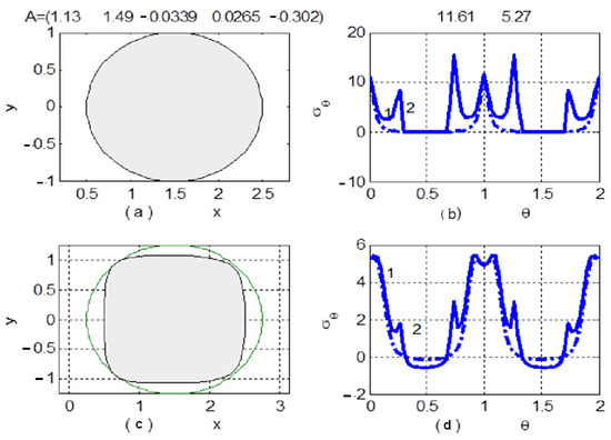 The chosen functional dependence (9) for describing the contour is used in the conformal mapping of the exterior of the hole onto the exterior of a circle of unit radius. It is known that for an arbitrary region, there exists a mapping function of the form (9) when . That is, by choosing a sufficiently great J here, any hole profile can be obtained. The coefficients must be such that the condition is satisfied [28]. For this problem, there is an optimal hole near which there is no stress concentration—a rectilinear section parallel to the Oy-axis. However, this case has no practical value. Let us narrow down the class of holes among which we will search for the optimal hole.