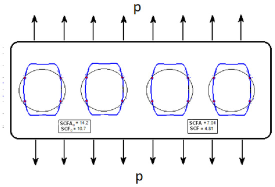 The SCF calculated for this case is equal to 5.913 for graphite-epoxy and 4.542 for boron-epoxy plates. That is, these values are significantly smaller than those for the case of a circular hole (see Table 2). At the same time, (Figure 4a,c) it can be seen that the fracture will begin at the four points on the boundary in which the value of is significantly greater than the maximum stresses. These points for the two materials are on the rounded boundary arcs (shown in dots). The value of the permissible loads for these two plates will be 63.4 MPa and 151.1 MPa, i.e., much less than those for a circular hole.