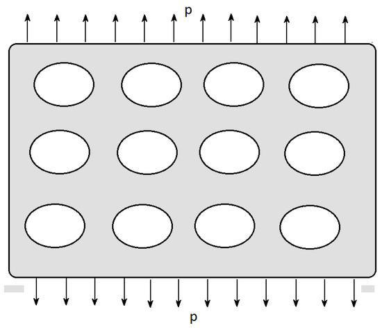 Two-period problem. Perforated plates with a large number of holes are often used. In this case, consider a two-period system of holes. Green’s junction (potentials ) is given in [30,31]. Let us assume that the main period has the shape of a square with side d, and the plate is stretched by loads p in the direction of the Oy-axis (Figure 12).