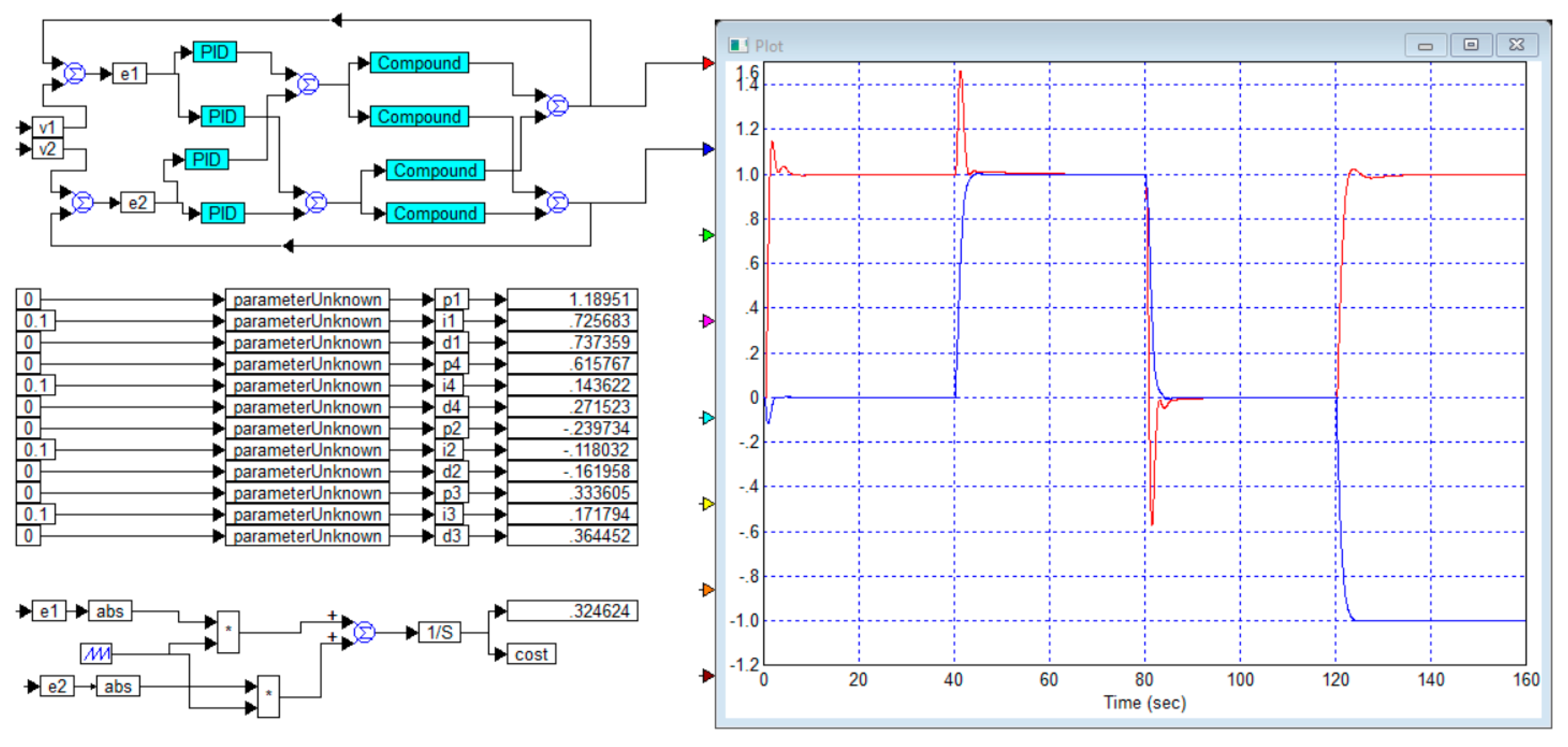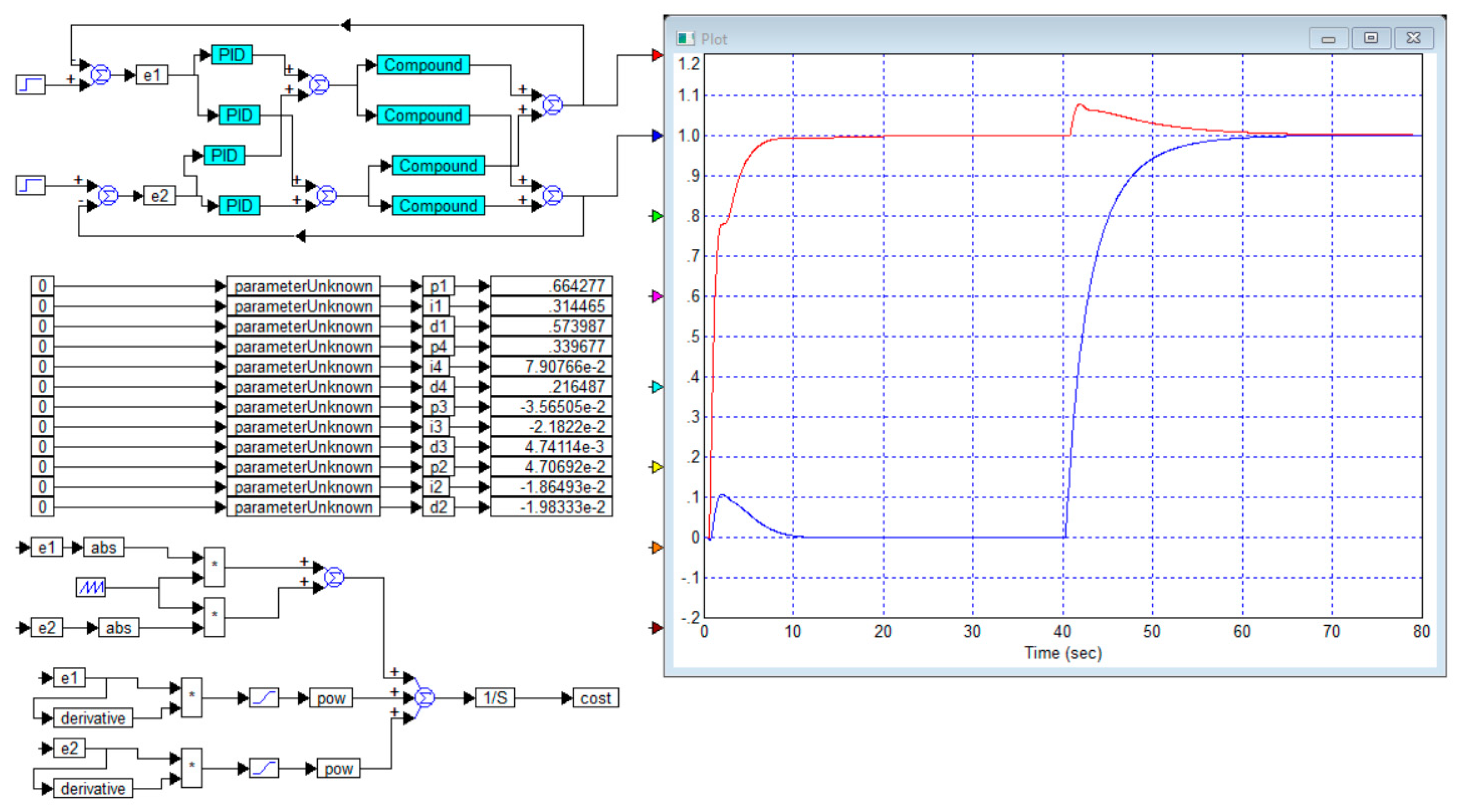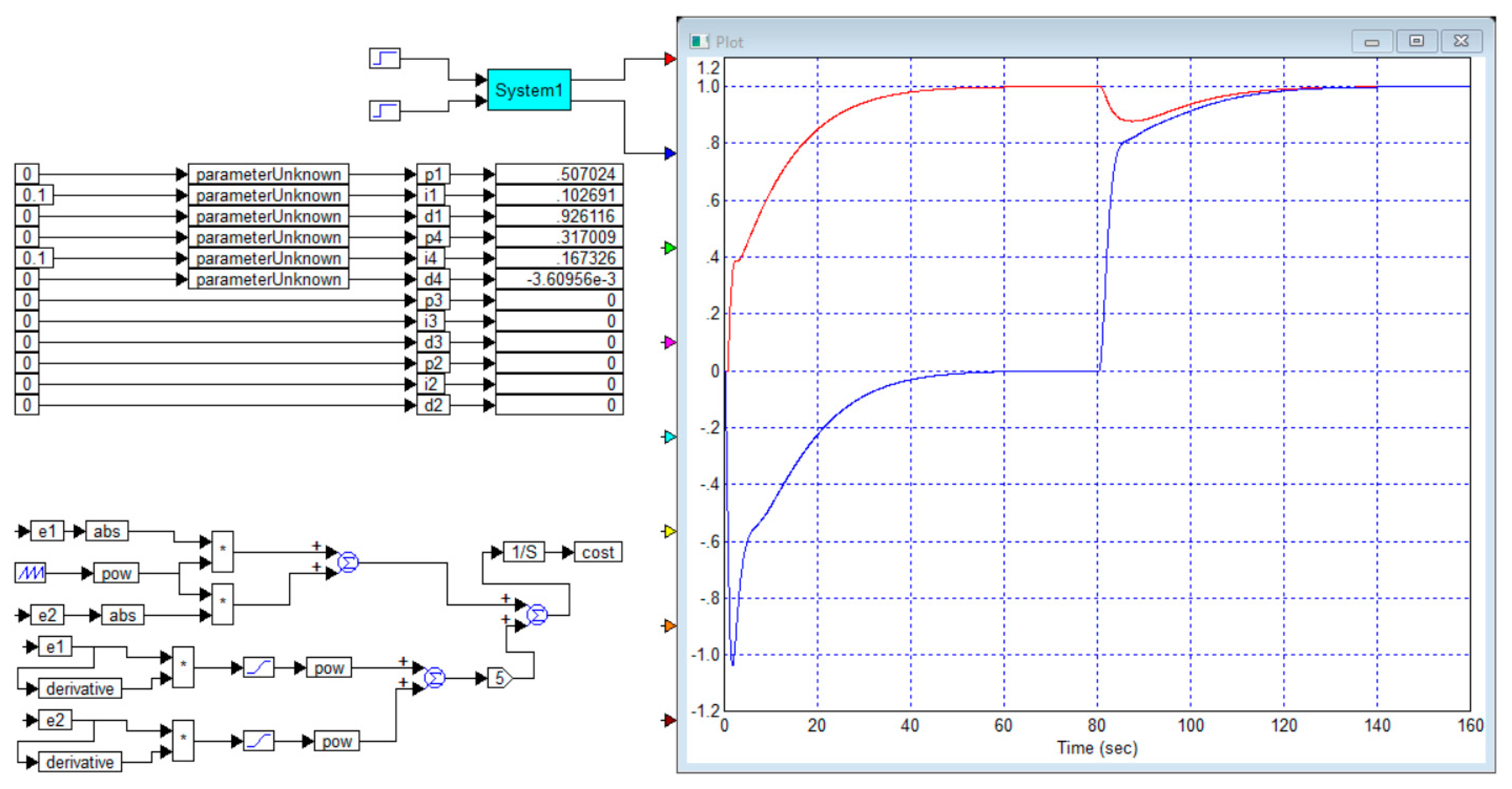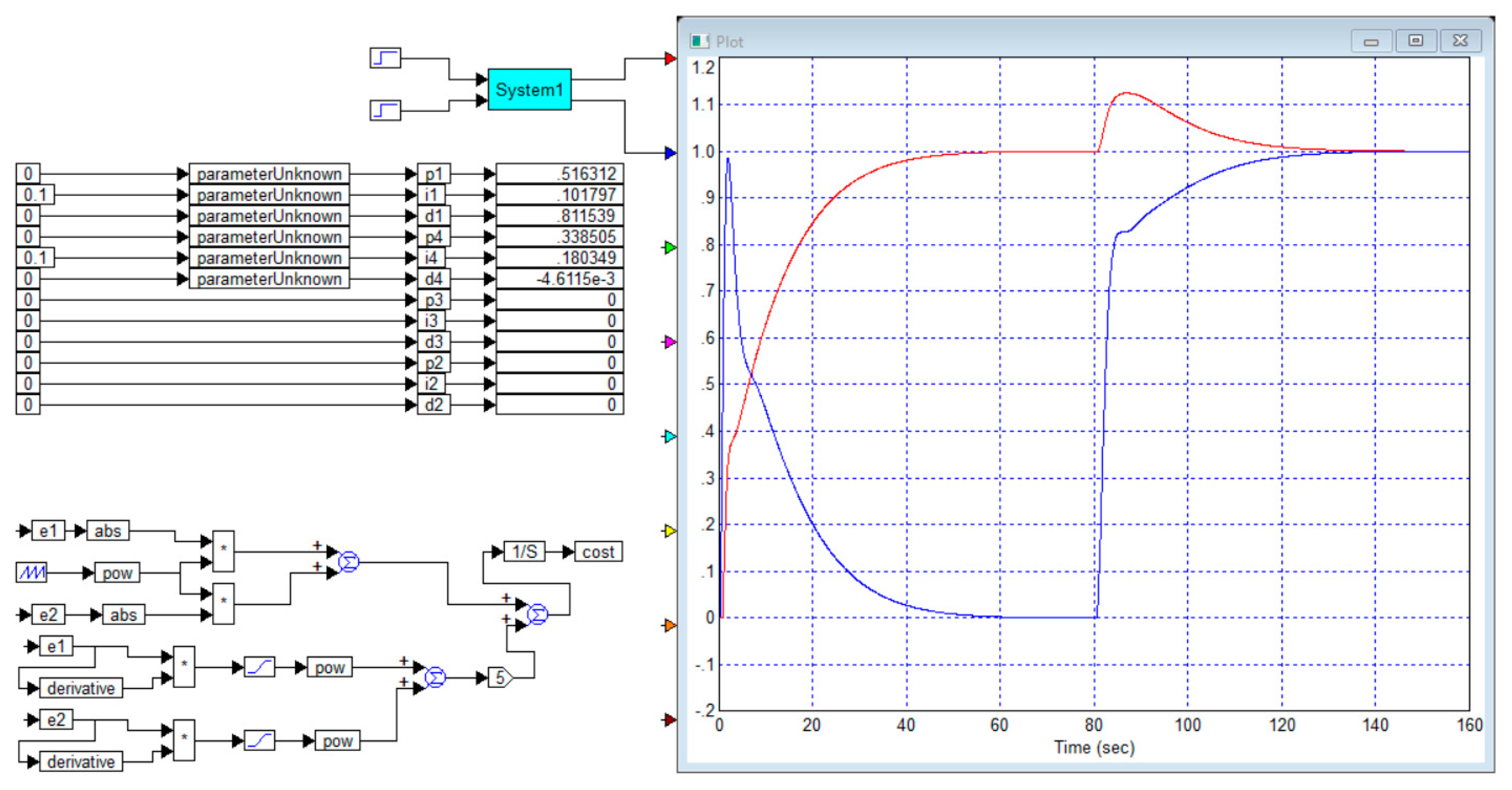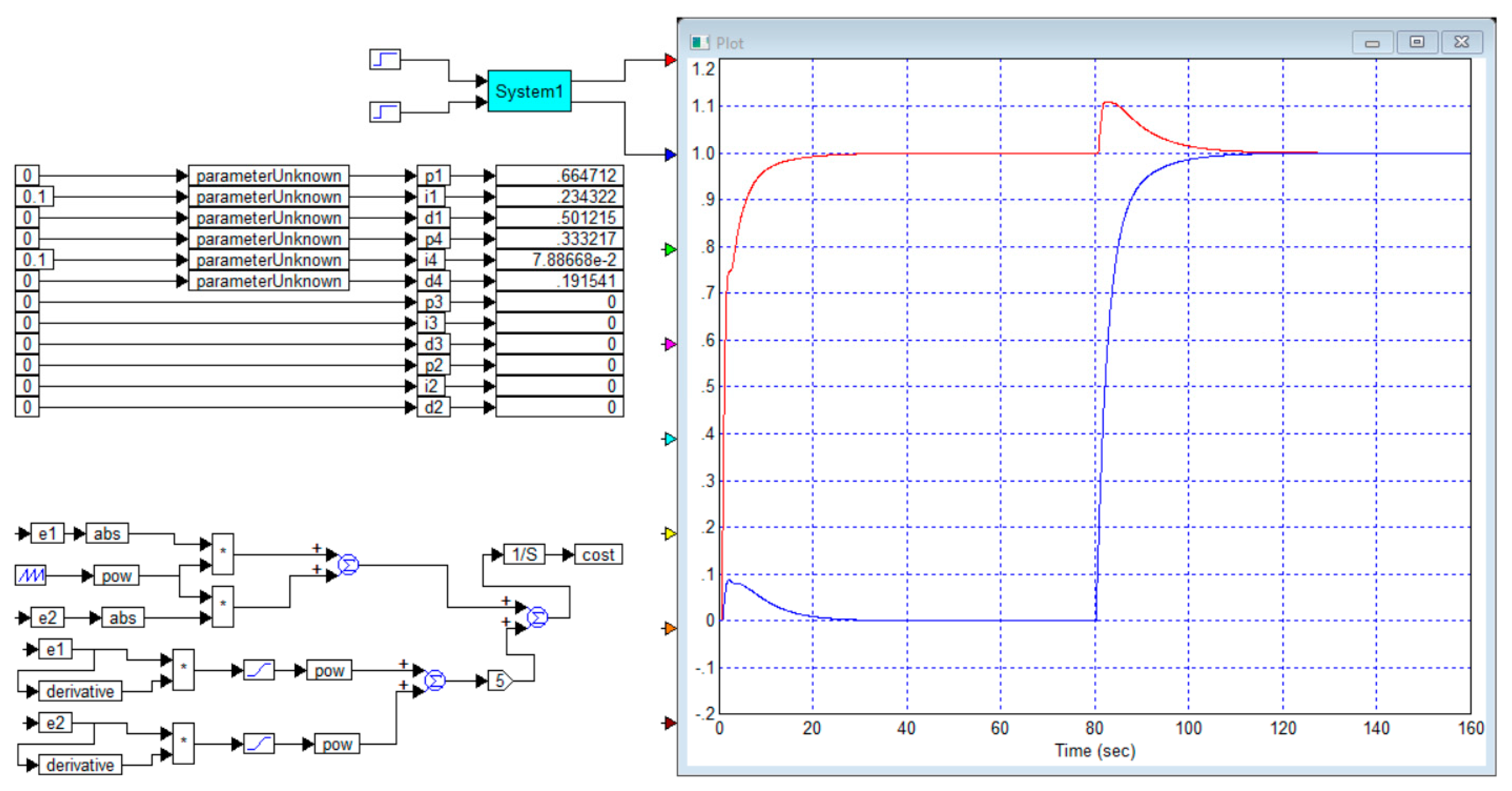 Figure 7 shows the structure project and the result of optimization of the full PID controller for such an object from Example 3. This system is stable, but the response of the second channel to the step jump of the first channel is too large. It reaches 75%, and its duration is 30 s. The response of the first channel to the jump in the second channel’s task is 14%, its duration to the level of 50% of the maximum value is less than 5 s, but the duration of its noticeable part is about 40 s. In this case, control for each channel is carried out without overshoot; the duration of the processes is from 40 s (for the second channel) to 60 s (for the first channel).