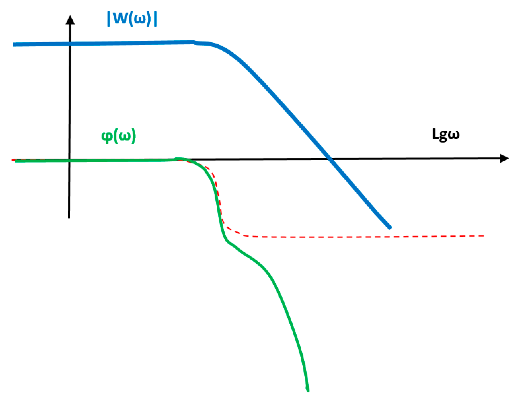 The problem with using this method is that each object has a transfer function , limited by some frequency band. With increasing frequency, the transfer function decreases , although in some local frequency ranges it can increase. However, starting from some frequencies, it decreases so sharply that no amplification of the input control signal can achieve a significant response at the object output. For this reason, the transfer function of the entire loop in a conditionally open form inevitably reaches a value close to unity and then decreases even more. In the frequency range where this value is much less than unity, the control loop no longer has a noticeable effect on the object, so its output signal in this frequency range is not controllable. We must put up with this. But in the intermediate frequency band between those where the transfer function of the circuit is much greater than unity, which allows control of the object, and those where the transfer function is much less than unity, which excludes the possibility of controlling the object, there is a frequency region where the transfer function of the circuit is in the range from 0.1 to 10, i.e., from to . In this frequency range, the behavior of the transfer function of the loop affects the stability of the system. If at these frequencies the signal delay exceeds (or which is the same value in other measure units) then the system will be unstable. Therefore, the art of the designer of locked dynamic systems consists in calculating such a controller that would ensure the stability of the locked system, as well as its sufficient accuracy in the frequency region where control is provided.