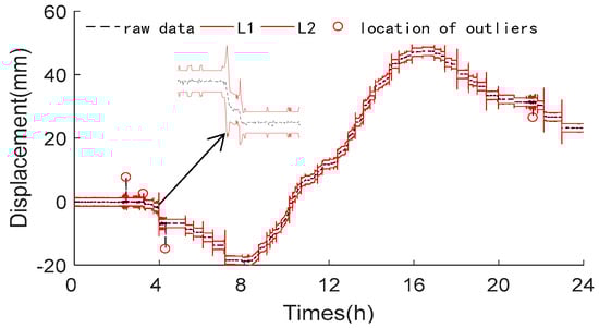 Given these challenges, abnormal data in bridge structural health monitoring systems are, to some extent, inevitable. While abnormal data occurrence cannot be entirely eliminated, their impact on system functionality can be minimized through proactive measures. Consequently, monitoring data must undergo rigorous preprocessing before extracting structural performance to ensure the reliability and accuracy of analytical results [31]. Therefore, data cleaning is a crucial step to ensure data quality and the proper functioning of system applications in SHM. There exist several criteria for outlier elimination in statistics, including the Pauta criterion, Chauvenet criterion, and Grubbs criterion. Among them, the Grubbs criterion stands out due to its theoretical rigor, adaptability to small samples, iterative detection capability, and strong resistance to interference, making it a significant method for anomaly data discrimination [32]. However, in bridge structural health monitoring systems, the relatively large volume of monitoring data, combined with the influence of long-term temperature trends, results in significant data dispersion, as shown in Figure 2a. Considering that trend data significantly influence the statistical characteristics of raw data, the Grubbs criterion is applied to the residual data after trend removal for outlier identification, as illustrated in Figure 2b. Here, L1 and L2 represent the upper and lower bounds for outlier detection. It can be observed that the traditional Grubbs criterion enables the localization and identification of outliers. Nevertheless, it struggles to capture outliers that deviate slightly from the true values. Consequently, it is difficult to achieve satisfactory results when applying the Grubbs criterion to handle outliers in a large volume of raw data.