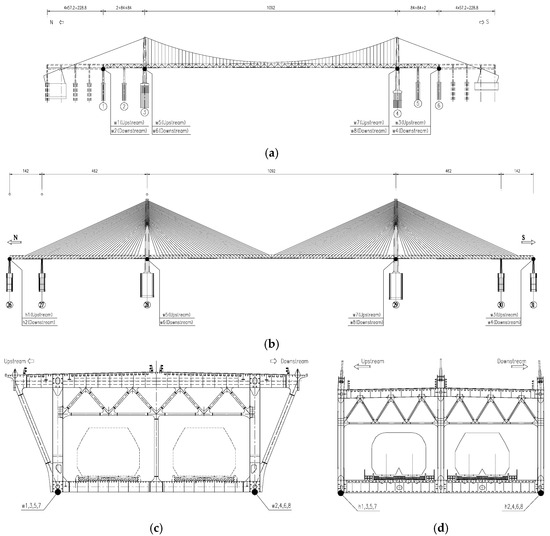 Bridge W is a railway suspension bridge with a five-span arrangement of (84 + 84 + 1092 + 84 + 84) m [33], as shown in Figure 4a. Bridge H is a railway cable-stayed bridge featuring a symmetrical span configuration of (140 + 462 + 1092 + 462 + 140) m [34] (see Figure 4b). Both bridges utilize steel truss girders, whose cross-sectional details are provided in Figure 4c,d. Displacement monitoring sensors were installed at the north and south girder ends and main tower locations.