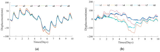 The normalized displacements for the two bridges are denoted as and , respectively, where j represents the sensor point number. The monitoring data of support displacements are presented in Figure 6a,b, while their statistical characteristics are summarized in Table 1.