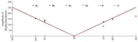 Spatial distribution of support displacement amplitude. Note: HN—north end of girder of H Bridge; WN—north end of girder of W Bridge; TN—north tower of H Bridge; M—center of the bridge; TS—south tower of H Bridge; WS—south end of girder of W ridge; HS—south end of girder of H Bridge; Wu—upstream of W Bridge; Wd—downstream of W Bridge; Hu—upstream of H Bridge; and Hd—downstream of H Bridge.