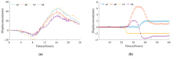 Throughout the analysis period, the absolute mean displacement differences between upstream and downstream supports at identical sectional positions of Bridges W and H ranged from 0.39 mm to 0.45 mm, demonstrating high consistency in displacement behavior. Both bridges exhibited quasi-sinusoidal daily displacement fluctuations, strongly correlated with temperature.