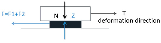 A further analysis was conducted on the variation mechanism of support displacements under the influence of train loads. As depicted in Figure 9, the pressure exerted by the bridge superstructure induces a specific frictional resistance between the main girder and its support. In this figure, N denotes the pressure from the superstructure, Z represents the support reaction force, T signifies the tensile force along the deformation direction, F indicates the frictional resistance at the support, F1 corresponds to the frictional resistance instantaneously released during sliding, and F2 is the residual frictional resistance retained within the support. During ambient temperature-induced deformation of the main girder, the frictional resistance F restricts minor deformations. When temperature fluctuations cause elongation or contraction exceeding F1, the support undergoes instantaneous sliding, thereby releasing the frictional resistance F1 generated by these minor deformations.