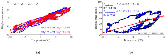 Correlation analysis between support displacement and temperature: (a) W Bridge; (b) H Bridge.