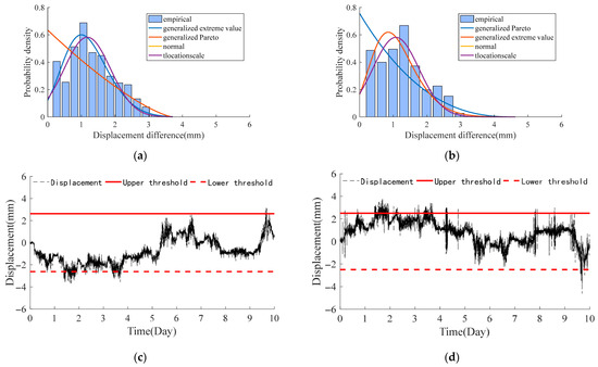 Optimal probabilistic statistical model and threshold: (a) H Bridge support displacement difference distribution (south tower), (b) H Bridge support displacement difference distribution (north tower), (c) H Bridge support displacement difference threshold (south tower), and (d) H Bridge support displacement difference threshold (north tower).