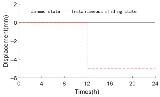 Various types of diseases of supports are highly likely to restrict the movement of supports, resulting in jamming phenomena. As shown in Figure 13, when significant wear on the support and jamming occurs, the support constrains the deformation of the beam. Consequently, on the displacement-time history curve of the support, a prolonged stagnation phenomenon is highly likely to appear. Moreover, when temperature variations cause a relatively large amount of expansion and contraction deformation of the main beam, under the condition of support wear, the support will generate a relatively large amount of sliding deformation in a short period to release the compressive deformation of the beam caused by temperature effects. Thus, on the displacement-time history curve of the support, one or more relatively large instantaneous sliding displacements will be presented.