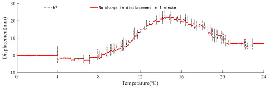 To quantitatively assess support wear and jamming conditions, a method for evaluating support activity performance through jamming parameters was presented. We define a dimensionless jamming parameter that characterizes support mobility performance. As shown in Figure 14, the support displacement time-history curve for Bridge H (h7) is presented, with the periods during which the support exhibits minimal change (change values are less than the precision) highlighted in red on the time-history graph. The calculation method is as follows: