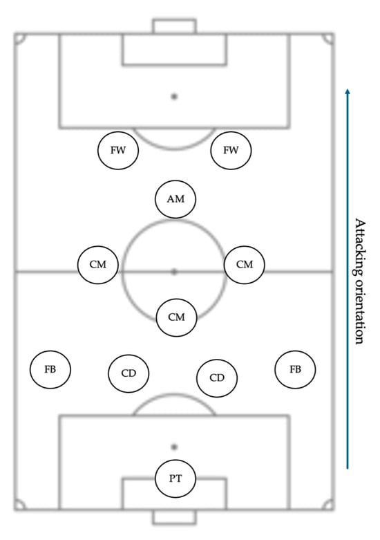 Four official league matches were included in the analysis. The team consistently employed a 1-4-4-2 diamond formation (Figure 1), comprising CD (two players), FB (two players), CM (three players), AM (one player), and FW (two players). Tracking began at kickoff and ended upon substitution or match conclusion. A total of 40 data entries were collected, distributed across different playing positions as follows: CD—8 records, FB—8 records, CM—12 records, AM—4 records, and FW—8 records. This distribution reflects the positional representation within the study sample. To avoid data overlap, matches selected were spaced by at least five days.