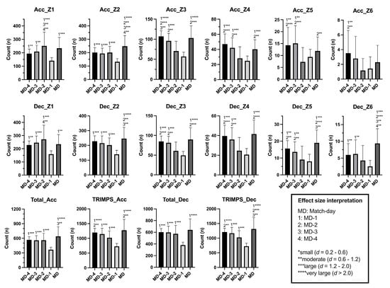 - High-intensity decelerations (Z3–Z6) demonstrated progressive increases from MD-1 to match day across all zones. Zone 3 decelerations nearly doubled from MD-1 to MD (p < 0.001), while Zone 4 showed similar patterns (d = 1.80, p < 0.001). The most intense deceleration zones (Z5–Z6) exhibited the largest relative increases, with Zone 6 showing a nearly four-fold increase from MD-1 to MD (d = 1.91, p < 0.001).