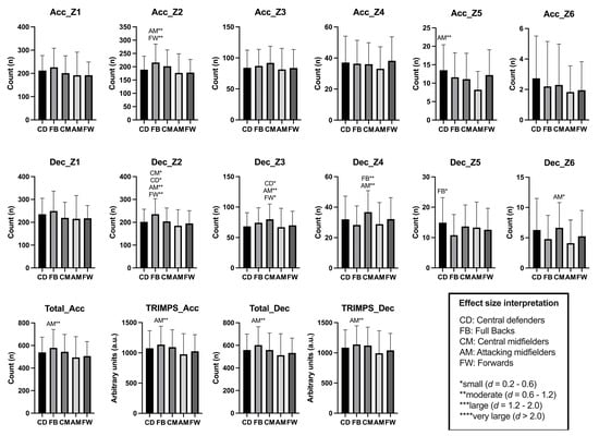 - High-intensity (Z3–Z6): CM demonstrated superior engagement compared to other positions. Zone 3 decelerations showed CM significantly outperforming AM (d = 0.79, p = 0.005). Zone 4 decelerations (p = 0.003) revealed CM significantly exceeding both FB (d = 0.74) and AM (d = 0.77). The pattern continued in Zone 6 (p = 0.01), where CM again obtained higher values than AM (d = 0.57). Notably, Zone 5 decelerations showed CD significantly exceeding FB (d = 0.58, p = 0.04).