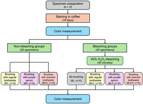 Two thousand five hundred toothbrushing cycles were selected in the current study as this is reportedly equivalent to approximately three months of twice-daily brushing [37,59], which is a relevant duration for patients seeking dental consultation following bleaching treatment and a clinically translatable approximation of cumulative daily oral hygiene practices, offering insight into the durability and esthetic longevity of PRMs under simulated real-life conditions. In the study, soft-bristled toothbrushes with a low 1 N load were used for brushing simulation. This was conducted to simulate the gentle purple tooth serum application method recommended by the manufacturer while following ISO standard guidelines for toothbrushing simulation with toothpastes (ISO/TR 14569-1:2007) [63], which specify a load between 0.5 and 2.5 N for in vitro testing [61,62]. However, this brushing method still presents a deviation from the gentle cotton swab application of the serum. All specimens were rinsed gently after brushing to provide a standardized color testing surface for all treatment groups. This complied with the recommendations of the tooth serum and tested toothpaste manufacturers.