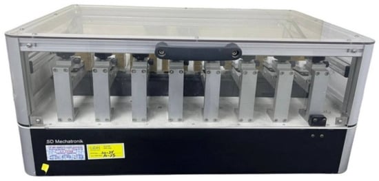 Cylindrical acrylic blocks with a circular central well (Ecocryl cold, Protechno, Vilamalla, Spain) were produced using a silicone mold to hold the tested SPR specimens in place during the brushing simulation. Specimens were secured to the central wells of the acrylic blocks using vinyl polysiloxane impression material (Express XT Putty Soft, 3 M ESPE, Maplewood, MN, USA) and mounted to the test stations of the brushing simulation machine containing eight test stations (Toothbrush simulator ZM-3, SD Mechatronik GmbH, Feldkirchen-Westerham, Germany), as shown in Figure 3.