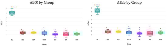 The Games-Howell test was used to compare the mean ΔE00 of the groups in pairs to find out which was significantly different (η2 = 0.92, Cohen’s d > 9). It revealed that the pairwise group comparisons of BC-BL, BP-BL, BCH-BL, BLC-BL, BLP-BL, and BLCH-BL had an adjusted p-value less than 0.001, and thus, based on the available data, it can be assumed that these groups were significantly different in pairs. Tukey’s HSD post hoc test was used to compare the mean ΔEab of the groups in pairs, and it revealed the same significant differences found in the ΔE00 results. The graphical representation of statistically significant pairwise comparison differences is represented in Figure 4, and the complete analysis is in Appendix B.