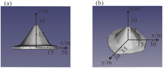Firstly, we modeled Mausoleum No. 2 of the XiXia Imperial Tombs and carried out a feasibility analysis, including the design of the detection array and its orientation, the assessment of the measurement duration, etc. The bottom diameter of Mausoleum No. 2 of the XiXia Imperial Tombs is approximately 30 m, and its height is about 20 m. We extracted the elevation and shape information of Mausoleum No. 2 from CAD files and carried out the modeling, as shown in Figure 2 Considering the limited observation time this time, in order to complete the imaging of the overall structural features of the imperial mausoleum as soon as possible and ensure the imaging efficiency and basic effect, we conducted observation simulation experiments to determine the observation parameters. The schematic diagram of the muon simulation detection experiment can refer to Figure 1.