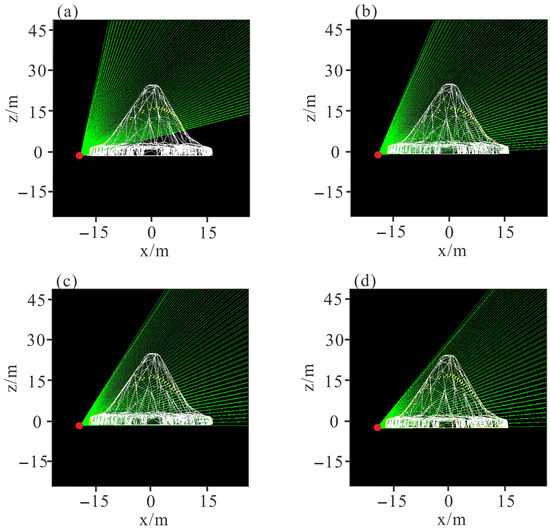 Diagrams of different zenith angles in the muon detection simulation experiment. (a) The zenith angle is 30 degrees; (b) The zenith angle is 45 degrees; (c) The zenith angle is 60 degrees; (d) The zenith angle is 70 degrees.