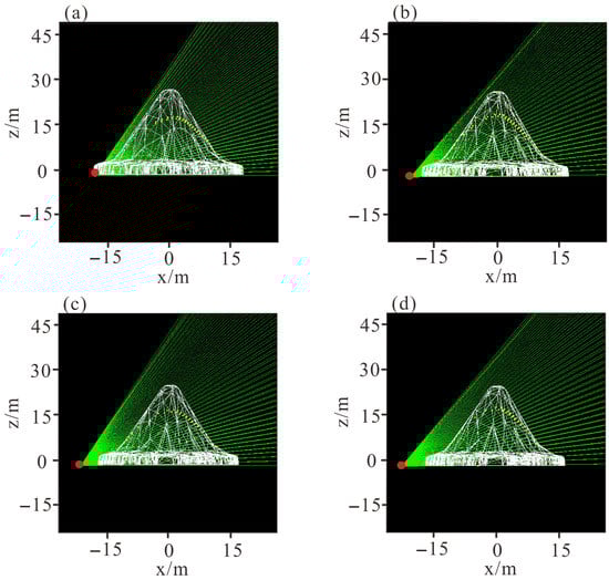 Diagrams of different positions of the detector in the muon detection simulation experiment relative to the bottom of the imperial tomb. (a) One meter from the bottom of the imperial tomb; (b) Three meters from the bottom of the imperial tomb; (c) Five meters from the bottom of the imperial tomb; (d) Seven meters from the bottom of the imperial tomb.