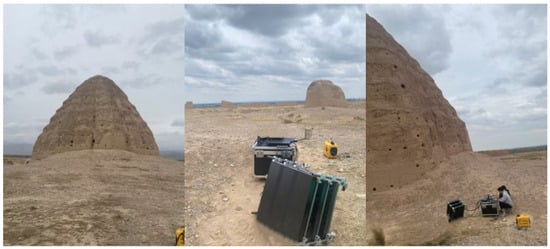 According to the feasibility analysis and scheme design, we placed the muon detector at the measuring point 3 m away from the bottom edge of Mausoleum No. 2 of the XiXia Imperial Tombs and rotated the detector so that the receiving angle faced Mausoleum No. 2 of the XiXia Imperial Tombs for measurement. The schematic diagram of muon detection is shown in Figure 1. The cosmic ray muon imaging detector device used in this study is a scintillator detector, which can be conveniently operated in fieldwork. The scintillator detector used in this study is composed of three detection planes, with a distance interval of 20 cm between each detection plane. The effective detection area of the detector is greater than or equal to 2500 cm2, the position resolution is greater than or equal to 2.5 cm, the detection efficiency of the detector is greater than or equal to 92%, the time resolution is greater than or equal to 10 ns, and the size of the scintillator strip is 50 cm by 2 cm by 1 cm.