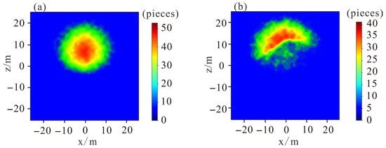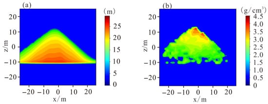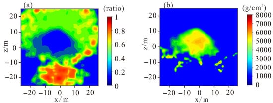 In Figure 7a,b, the horizontal and vertical axes represent the same meanings as in Figure 6. In Figure 7a, areas where the color approaches red indicate a high ratio of muon flux and a high survival rate, while areas approaching blue indicate the opposite. In Figure 7b, areas where the color approaches red indicate a large value of density length, and areas approaching blue indicate the opposite. We present the density-length product distribution in the coordinate system, as shown in Figure 7b. Given the known terrain, as shown in Figure 8a, we obtained the length that the rays passed through by means of modeling, and thus the density distribution could be calculated by dividing the density-length product by this path length. Finally, according to the length that the muons passed through (as shown in Figure 8a), the corresponding density distribution was obtained (as shown in Figure 8b). In Figure 8a,b, the horizontal and vertical axes represent the same meanings as in Figure 6. In Figure 8a, areas where the color approaches red indicate that the length of muon rays passing through the XiXia mausoleum tower is large, while areas approaching blue indicate the opposite. In Figure 8b, areas where the color approaches red represent high density.