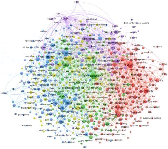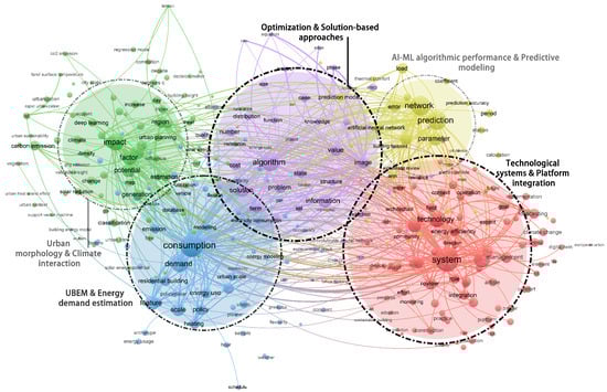 Figure 1 and Figure 2 present keyword co-occurrence networks that synthesize prevailing research themes and illustrate the progression toward integrated, AI-driven frameworks in urban building energy modeling, indicating a convergence of the previously isolated domains: UBEM, MOO, urban morphology and climate interactions, technological systems integration, and AI-based prediction methods.
