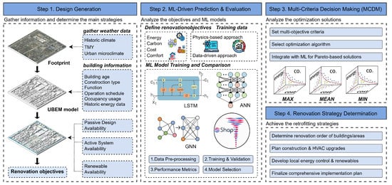In dense urban areas dominated by aging building stocks, Urban Building Energy Retrofit (UBER) has become a crucial strategy for decarbonization and climate resilience, especially in city centers and old districts facing outdated facades, poor indoor comfort, rising energy demand, and evolving functional needs [,]. The UBER process entails complex trade-offs among energy performance, occupant comfort, environmental impact, and economic feasibility, requiring urban-scale energy modeling with high spatial-temporal granularity [,]. Urban Building Energy Modeling (UBEM), essential for planning, must account for heterogeneous stocks, urban interactions (e.g., mutual shading, heat island effects), and diverse occupant behaviors—factors whose omission may lead to energy savings underestimation of up to 7% []. Yet, limited high-resolution data on geometry, usage patterns, and operations remains a key barrier [,,]. To overcome these challenges, recent UBEM workflows integrate AI-enhanced surrogate models and ML techniques such as ANN, RF, and XGB, which accelerate simulation, predict energy use, and optimize retrofits with minimal physical inputs [,,,,]. ML also supports MOO across energy, cost, and comfort while enabling district-scale forecasting, occupant modeling, and smart grid integration [,,]. In this shift from isolated retrofits to systemic solutions, the convergence of ML, GIS, and UBEM offers scalable, cost-effective pathways toward climate-neutral cities [,,].