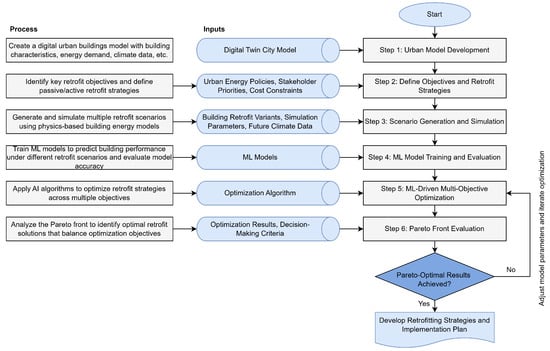 An emerging frontier is the explicit inclusion of future climate scenarios in retrofit optimization. Micro-genetic optimization embedded in physics-driven models has enabled long-term, climate-resilient strategy development, with case studies in Abu Dhabi, Changsha, and Toronto reporting up to 80% savings and robust adaptation to extreme events [,,]. For instance, a recent engineering-scale study in Toronto, Canada, demonstrates the application of micro-genetic optimization integrated with urban physics simulation for future-ready residential retrofits []. By coupling AI-based multi-variable optimization with climate scenario modeling, the research identified retrofit solutions that reduce annual gas use by over 80% and electricity demand by more than 60%, with payback periods under 20 years. The approach revealed that optimal strategies shift with projected climate conditions, underscoring the need for scenario-adaptive, cost-effective retrofit planning in municipal decarbonization efforts. These advances underscore the growing need for scenario-aware, adaptive frameworks that can anticipate both present and future urban energy challenges.