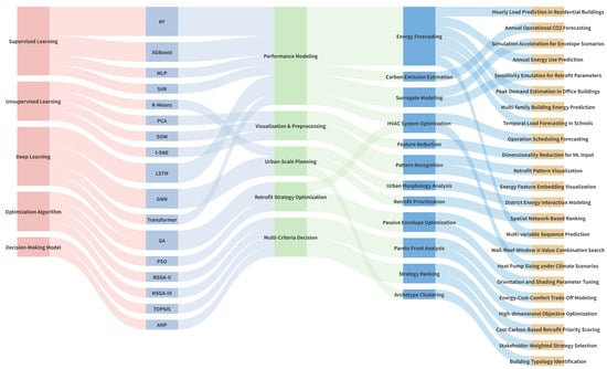 Retrofit-focused reviews have also gained momentum. Suppa and Ballarini [], Shu and Zhao [], and Ahmad et al. [] evaluated multi-criteria decision-making (MCDM), cost-benefit analysis, and environmental indicators for building stock retrofit planning. Abbasabadi and Ashayeri [] incorporated socio-behavioral uncertainty into retrofit potential assessments. Xu et al. [] and Mondal et al. [] addressed climate adaptation, while Mauree et al. [] reviewed urban-scale sustainability assessment methods. Nevertheless, these works treated ML as an ancillary tool rather than a strategic core of retrofit workflows.