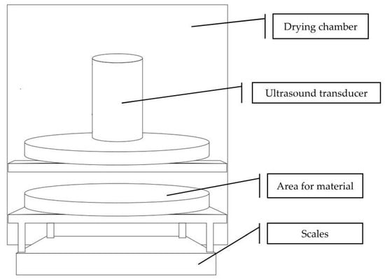 Fruits for drying were selected to obtain a homogeneous batch in terms of maturity and fruits size. 30 min before drying, the fruits were moved from the freezer and thawed at room temperature. Immediately before drying, the fruit was cut manually into slices (5 mm thick). The sample size was 250 g ± 10%. The drying experiments were conducted in a laboratory chamber dryer with air recirculation (Figure 1), according to the diagram below (Figure 2). The equipment allows constant control of air velocity and temperature. Ultrasound-assisted convective drying (UACD) was performed by installing an airborne ultrasonic system (Pusonics, Madrid, Spain) inside the drying chamber, which is capable of generating a 22 kHz sound field with a maximum power of 200 W. The ultrasound transducer was placed 10 cm above the drying sample, with the sample spread out to completely occupy the ultrasound impacted area. The transducer was equipped with a cooling system isolated from the air flowing in the chamber, protecting it from overheating. Convective drying (CD), which in this study was the control to which the results were compared, was carried out when the ultrasound generator was switched off. As the impact of US is greater at mild drying conditions [4], the lowest possible temperature and airflow at which drying occurs at a reasonable rate was used. The experiments were carried out at one temperature level, 50 °C, and at a constant air velocity (2.5 m/s). The average relative humidity of the air during drying was 15 ± 2%. Each drying experiment was conducted in triplicate and the drying lasted until the sample lost 88% of its initial weight. Drying kinetics were determined by the initial moisture content of the fruit sample and by automatically weighing the samples at fixed intervals of 1 min. The initial moisture content was measured by drying to a constant weight in a laboratory vacuum dryer at 70 °C and 30 mBar pressure.