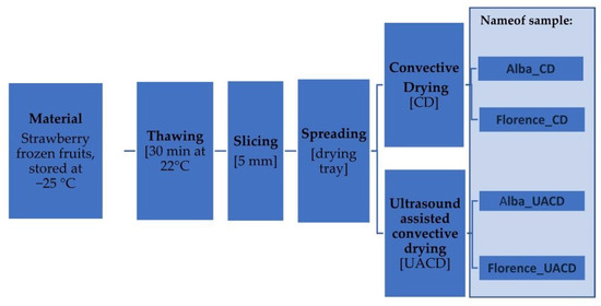 The strawberries (Fragaria × ananasa cv. ‘Florence’ and ‘Alba’) used in the study were purchased from producer in central Poland. Immediately after transport, the fruits were washed, sorted and the stalks were removed. The fruits, after surface drying, were frozen and stored at −25 °C until the day of experiment.