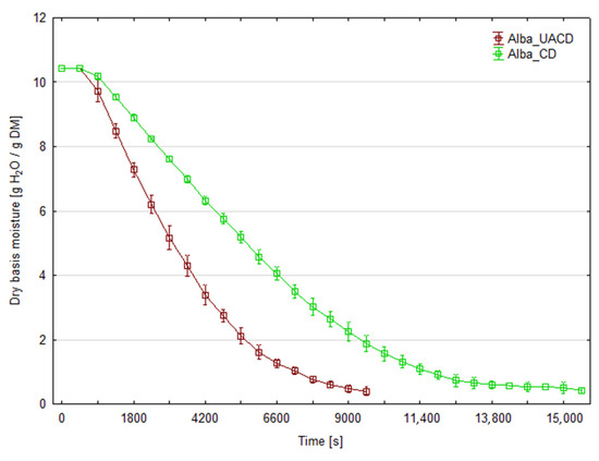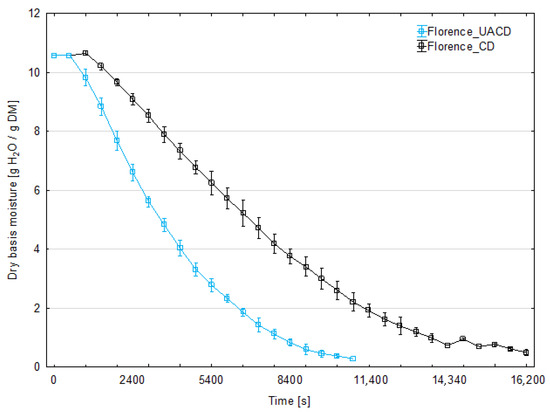 The initial moisture content of strawberry was 90.7% for ‘Florence’ cultivar and 91.4% for ‘Alba’. Figure 3 and Figure 4 present the changes in moisture content of dried strawberry slices during the drying process for both cultivars. At least three replicates were performed for each combination; the graphs show the averaged moisture changes (with bars of standard deviation). The use of ultrasonic assistance reduced the drying time for both cultivars. The duration of CD process was 280 min (16,800 s) for the ‘Florence’ cv. and 260 min (15,600 s) for the ‘Alba’ cv. For the ‘Florence’ cv., the process duration for UACD was 35.7% shorter than unassisted drying and lasted 180 min (10,800 s). For the ‘Alba’ cv. UACD lasted 170 min (10,200 s), thus was 34.6% shorter than unassisted drying. Similar results have been reported in the literature on other berries, for example ultrasonic assistance (100 or 200 W) in drying raspberries reduced drying time by 54% and 64%, respectively [12]. As described by the authors, the contribution of ultrasound was mainly due to the ‘vibration effect’, as the most dominant factor in increasing mass transfer during drying. Enhanced drying rates have been observed by other authors in apple drying experiments. In the case of apple slices, it was found that the use of ultrasonic energy significantly reduces drying time. For example, when US power levels of 90 W were used, a 57% reduction in drying time was observed for 5-mm-thick apple slices [13]. Other authors used cylinders of 0.035 m in diameter and 0.005 m in height. In this case, the use of 200 W ultrasound intensified the heat and mass exchange to achieve a 48% reduction in drying time [14]. It was observed that the lower the process temperature and the lower the air flow in the dryer, the greater the observed impact of the US application. An even more effective example of apple drying was the use of low air temperature (−10 °C), where an 80% reduction in process time was observed. In this case, a cube with a face surface area of 8.8 mm2 was used [15].